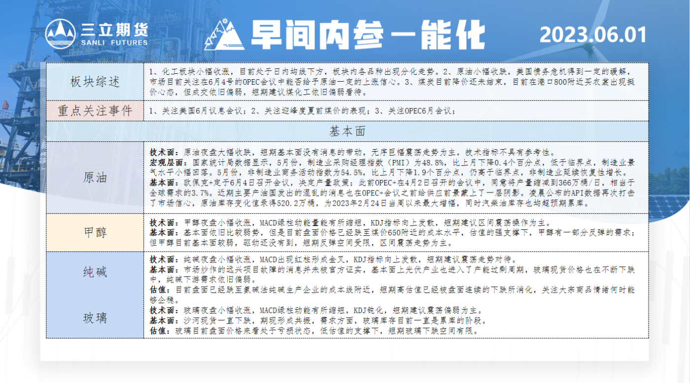 汇通财经APP讯——三立期货早间内参显示,化工板块小幅收涨,目前处于日内均线下方,板块内各品种出现分化走势。原油小幅收跌,美国债务危机得到一定的缓解.市场目前关注在6月4号的OPEC会议中能否给予原油...