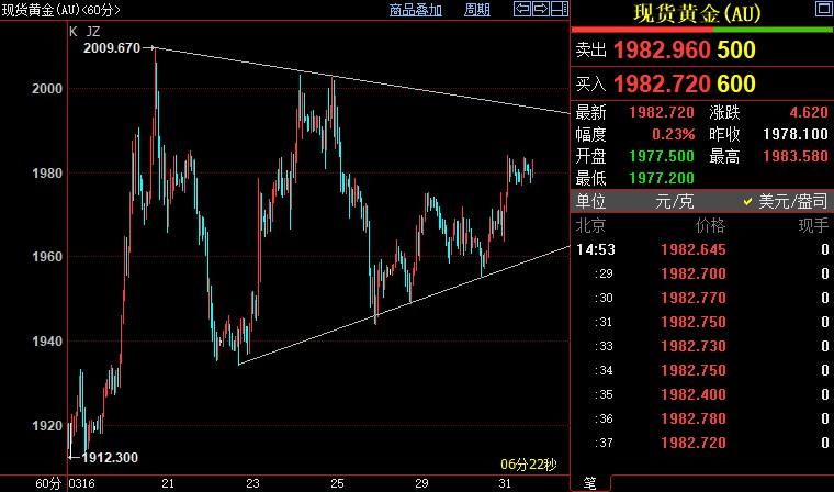 北京时间14:57,现货黄金上涨0.19%至1984.11美元/盎司;COMEX期金主力合约上涨0.20%至2001.7美元/盎司;美元指数上浮0.06%至102.231。