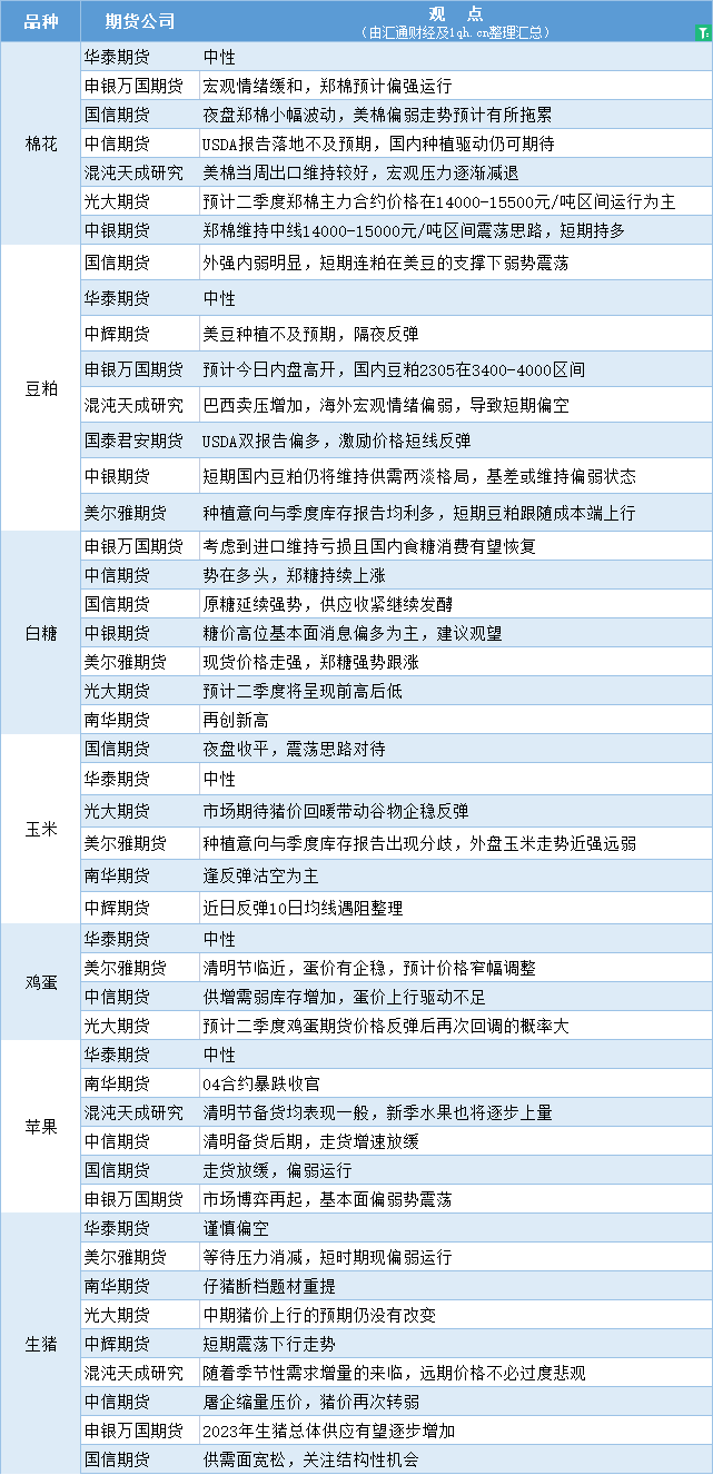 汇通财经APP讯——期货公司观点汇总一张图:4月3日农产品(棉花、豆粕、白糖、玉米、鸡蛋、生猪等)