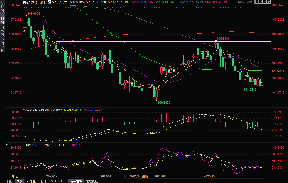 美元指数周一下跌0.48%,最大触及101.96,3月23日触及的近两个月低点支撑在101.91附近。目前来看,