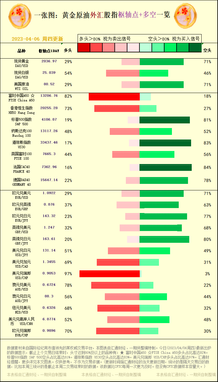 标题:一张图:黄金原油外汇股指"枢纽点+多空占比"一览(2023/04/06周四)