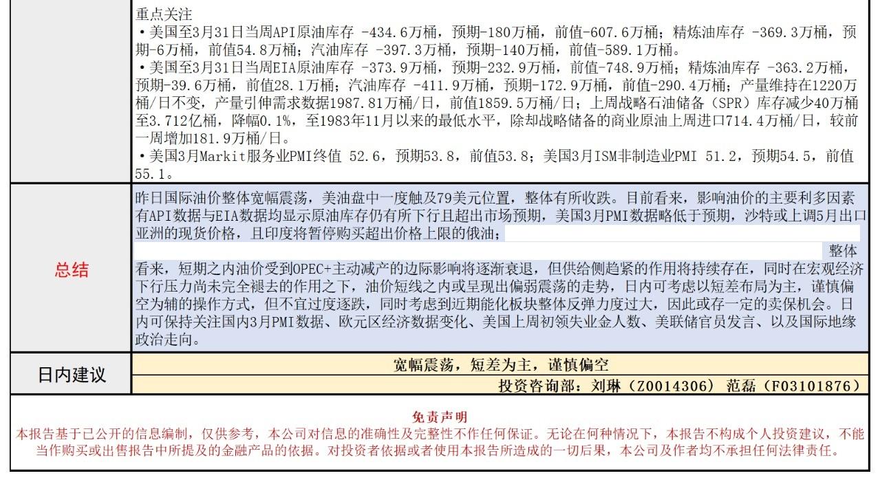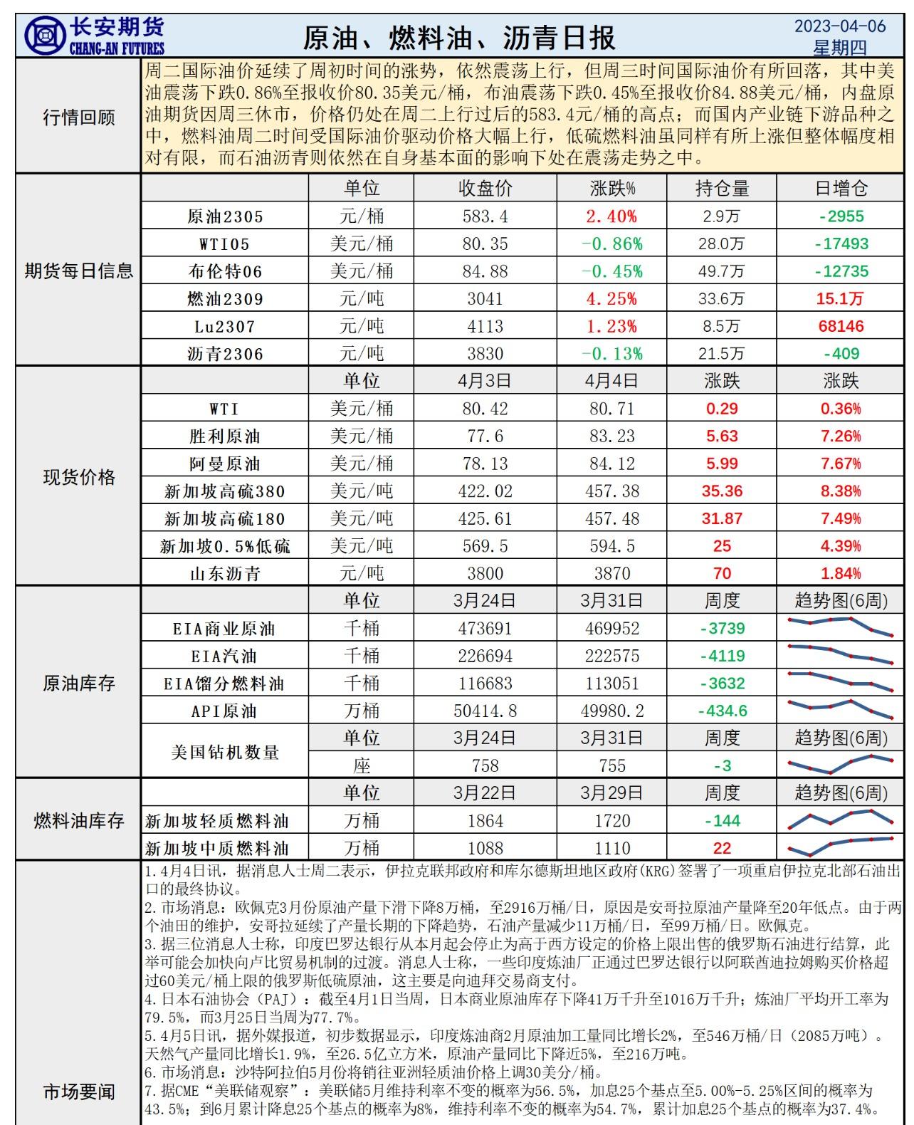 标题:长安期货4月6日原油报告:库存连续下降提振效果有限,减产边际作用减弱或存布空机会