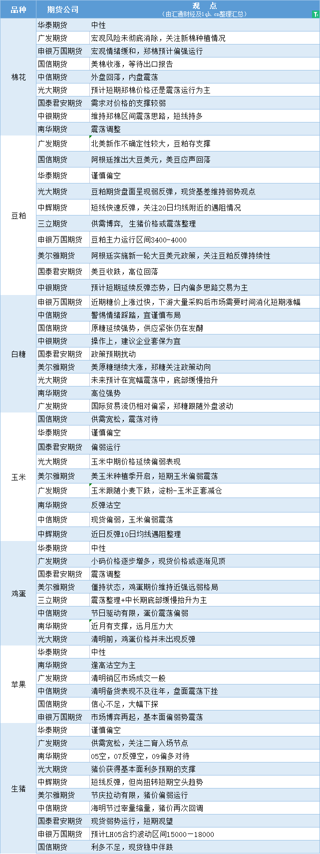 汇通财经APP讯——期货公司观点汇总一张图:4月6日农产品(棉花、豆粕、白糖、玉米、鸡蛋、生猪等)