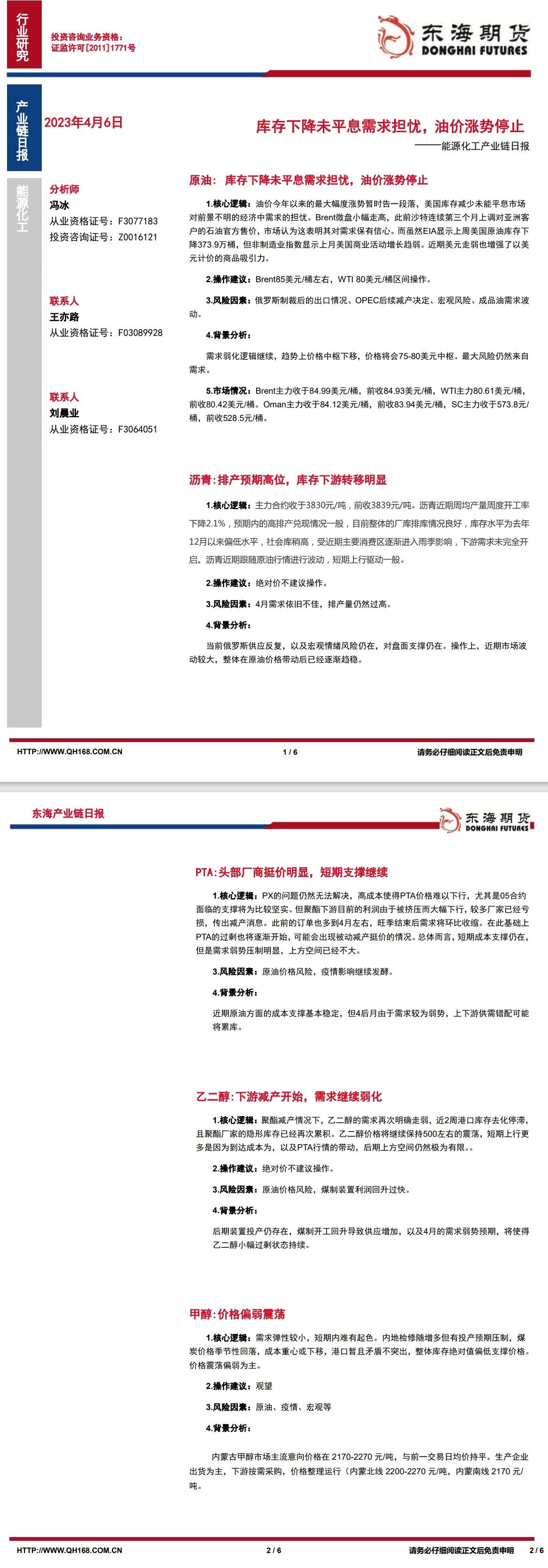 标题:【东海期货4月6日产业链日报】能化篇:库存下降未平息需求担忧,油价涨势停止