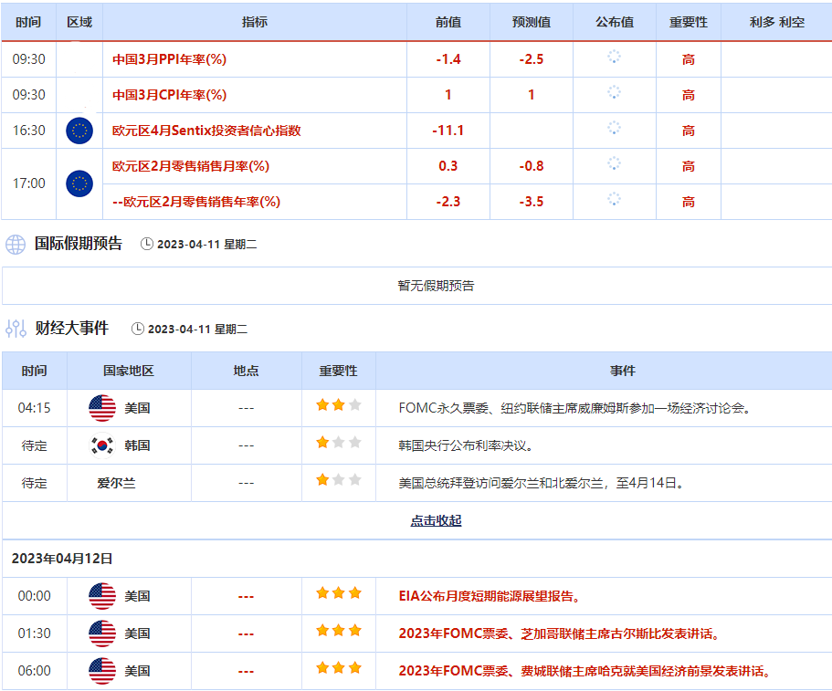周二(4月11日)关键词:中国3月CPI年率、美联储官员讲话