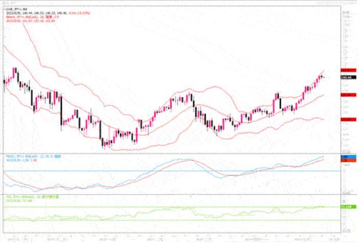 周一(5月29日)亚洲交易时段,美元兑日元短暂触及140.91的六个月高位后,尾盘有所回落最终收盘在近期高点附近的140.45水平。近阶段,债务违约风险所引发的美元避险买盘,以及美国经济数据强韧所引发的美元利率继续高调的预期,对日元均造成极大的冲击,仅就五月份里,日元兑美元跌幅近5%。进一步来说,在六月美联储利率会议召开前,由于市场预期其将继续加息25个基点,利率差的进一步拉大,显然还将对日元构成不利。日线图上,美元兑日元兼续沿着各短期均线攀升之中,技术指标指向超买区域,显示美元兑日元近期的回升势头还是较为强烈。短线4小时图存在一定的获利回吐的调整压力。整体上,美元兑日元存在着继续向前期高位靠拢的趋向。