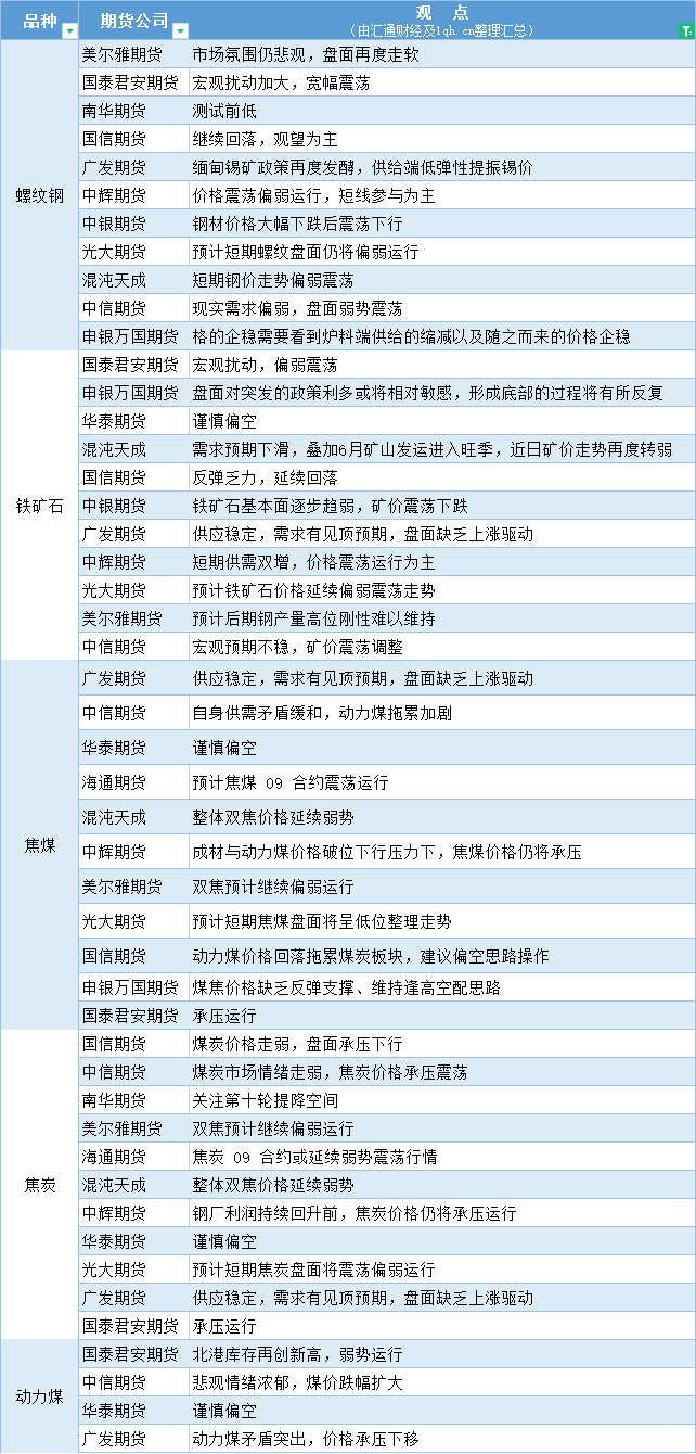 汇通财经APP讯——期货公司观点汇总一张图:5月31日黑色系(螺纹钢、焦煤、焦炭、铁矿石、动力煤等)