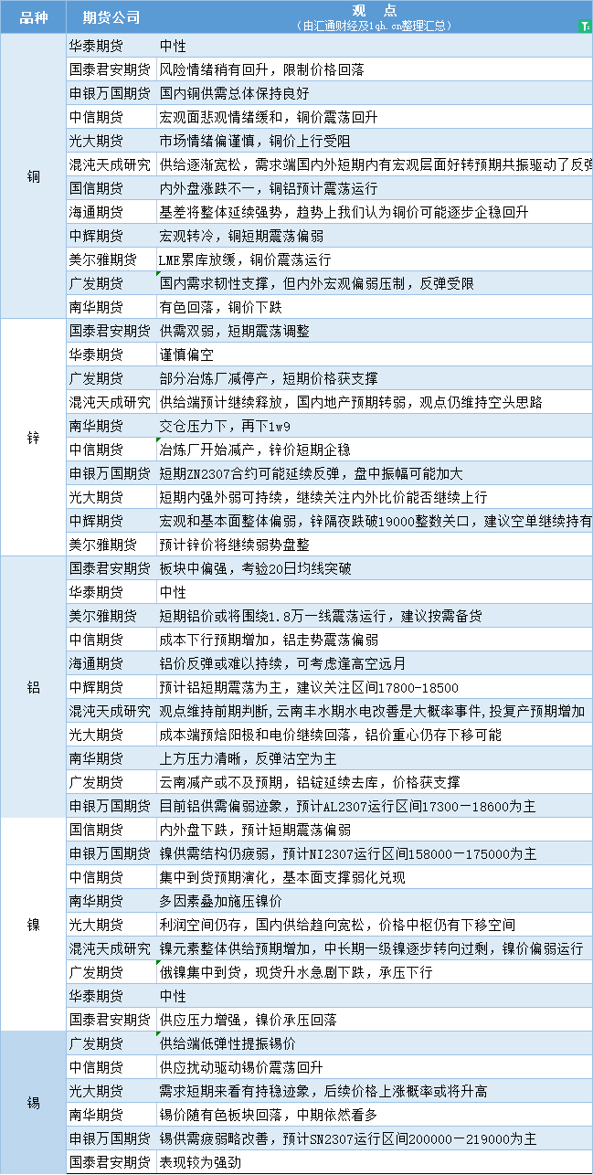 汇通财经APP讯——期货公司观点汇总一张图:6月1日有色系(铜、锌、铝、镍、锡等)
