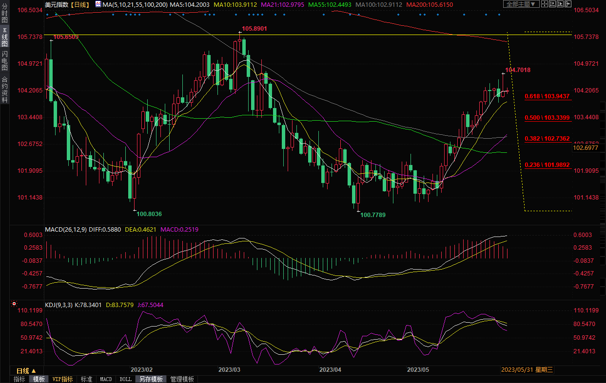 美元指数冲高回落,盘中一度创逾两个月新高至104.70,但尾盘回吐部分涨幅,收报104.22,涨幅约0.15%,因美联储官员的讲话打压了美联储6月份加息预期。