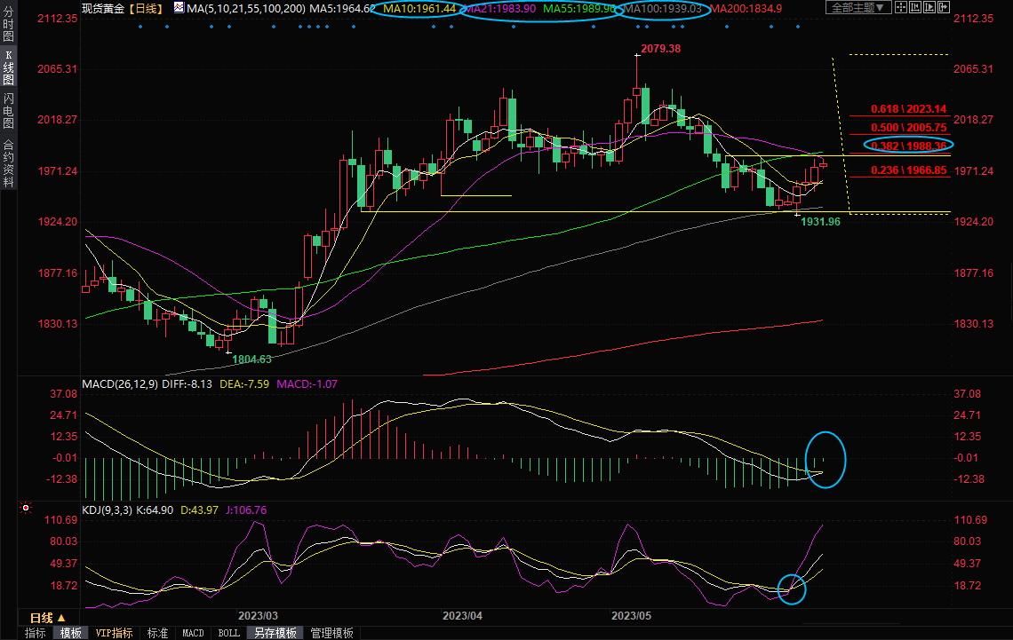 日线级别:震荡下跌后反弹;金价在100日均线的多重支撑位附近获得支撑后持续反弹,KDJ金叉良好运行,MACD绿色柱萎缩且有金叉趋势,5日均线初步上穿10日均线,在失守10日均线1961.52前,金价存在进一步反弹机会,初步阻力在21日均线1983.97附近,进一步阻力在2079-1932跌势的38.2%回撤位1988.36附近,55日均线阻力也在该位置附近,若能顶破该阻力,则有望进一步试探2000整数关口阻力,并增加看涨信号。