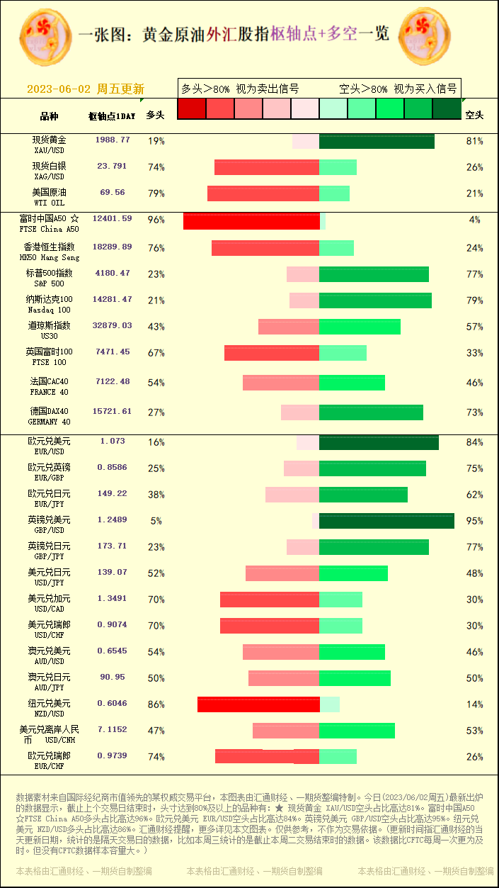 标题:一张图:2023/06/02黄金原油外汇股指"枢纽点+多空占比"一览