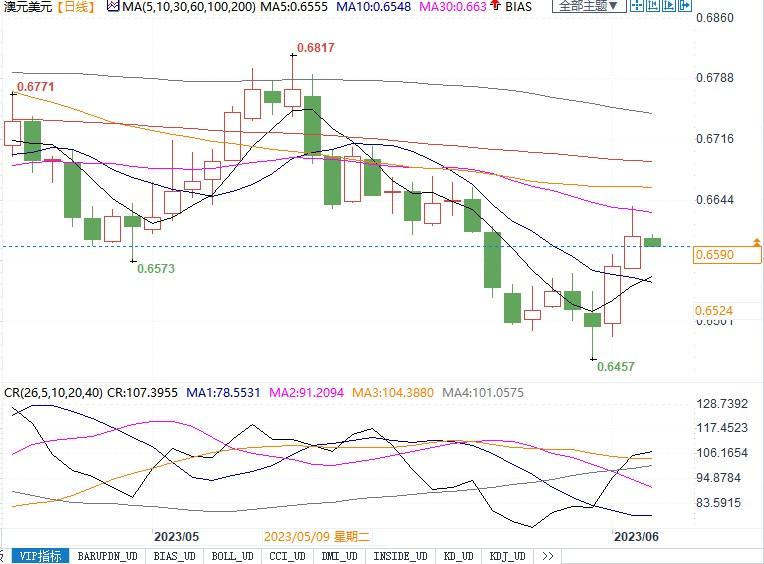北京时间6月5日9:22,澳元兑美元报0.6592/94