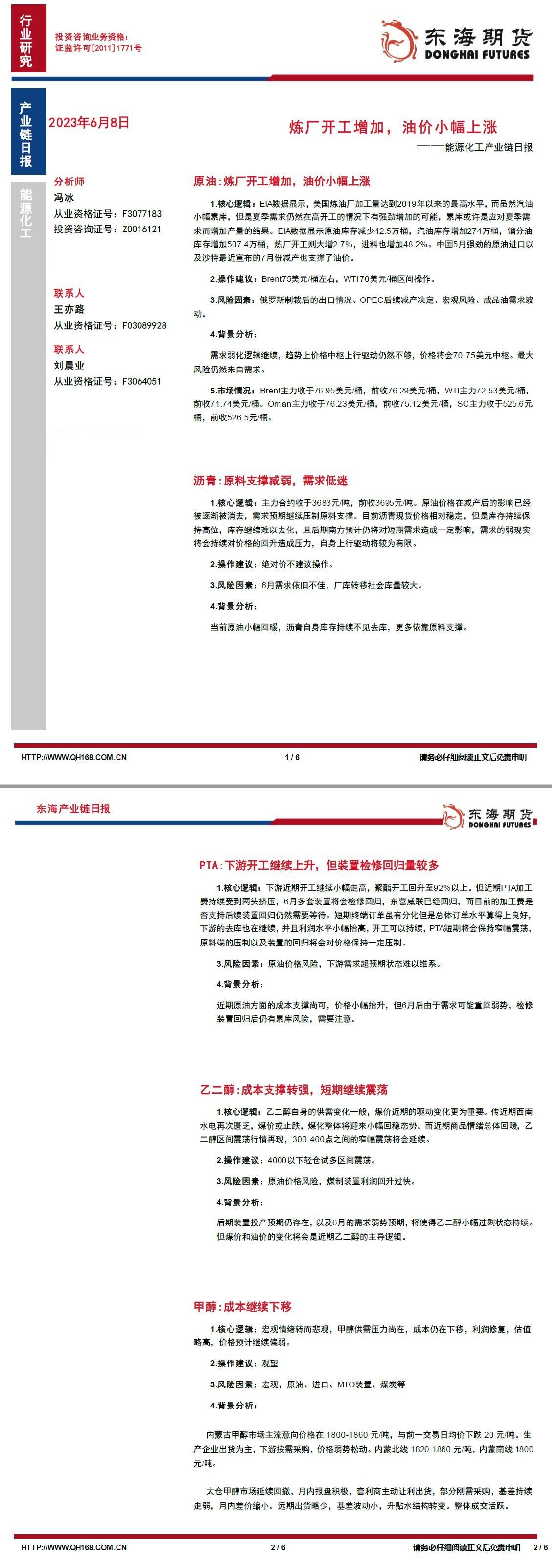标题:【东海期货6月8日产业链日报】能化篇:炼厂开工增加,油价小幅上涨