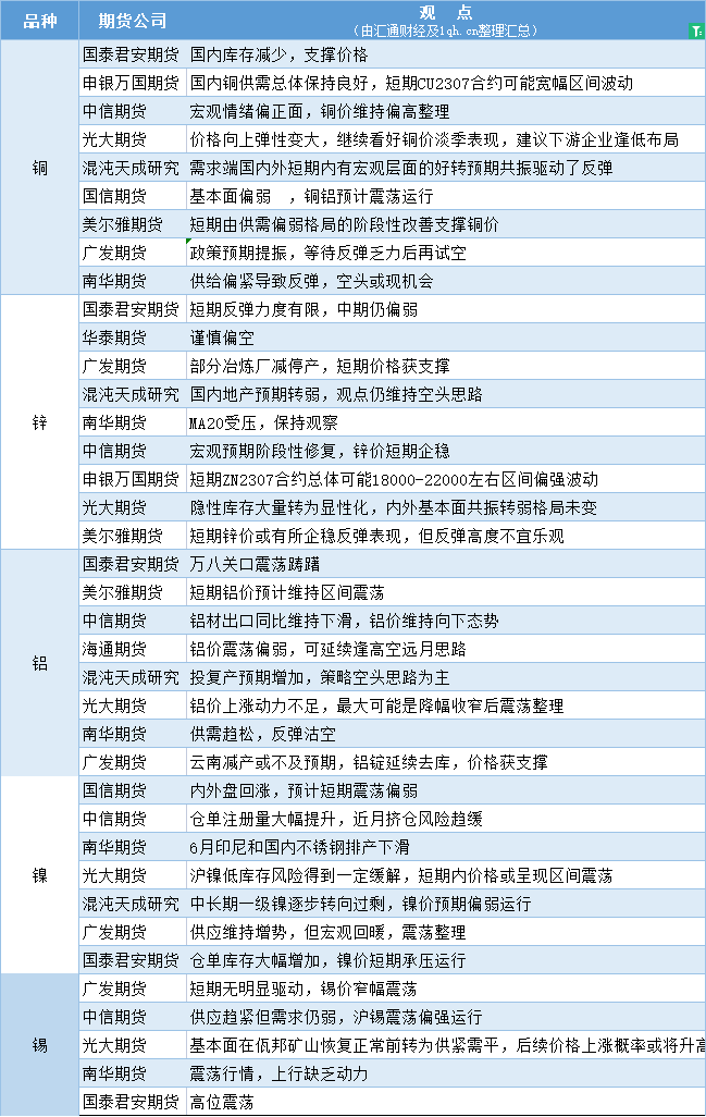 汇通财经APP讯——期货公司观点汇总一张图:6月8日有色系(铜、锌、铝、镍、锡等)