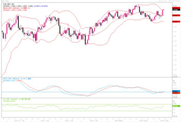 周四(6月8日)英镑兑美元上涨1.01%,至两周多以来的高位1.2560收盘。经济合作暨发展组织(OECD)周三发布的预测显示,2023年英国通胀率将达到6.9%,将为所有发达经济体中最高。市场仍预期未来几个月英国央行将再加息100个基点以遏制价格上涨。对利率敏感的英国两年期公债收益率周四触及去年9月“小型预算”引发动荡以来的最高水平,货币市场几乎完全消化了英国央行在6月22日加息25个基点的预期,还预计该央行在8月和9月开会时也会采取类似行动。在英央行加息前景仍会保持强劲的预期下,英镑料会继续得到相应的支撑。日线图上,英镑兑美元再度回升至各短期均线上方,技术指标MACD信号线回穿零轴之上,RSI也超越均衡线向上继续延伸,显示短线英镑颇受多头的支撑。上方继续上行的话,初步目标1.2600,继而是5月初到达过的高点1.2680。目前下方的强支撑水平还是在1.23之上。