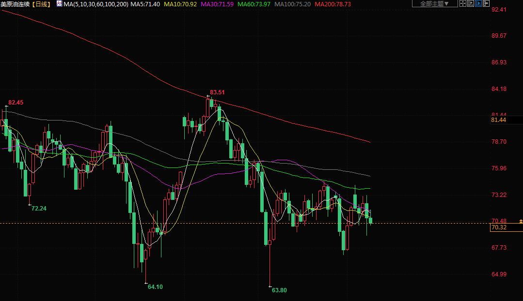 商品收盘情况:美国期金结算价下跌0.1%至1977.20美元。布伦特原油期货下跌1.5%,报收于每桶74.79美元;美国原油下跌1.6%,至每桶70.17美元。