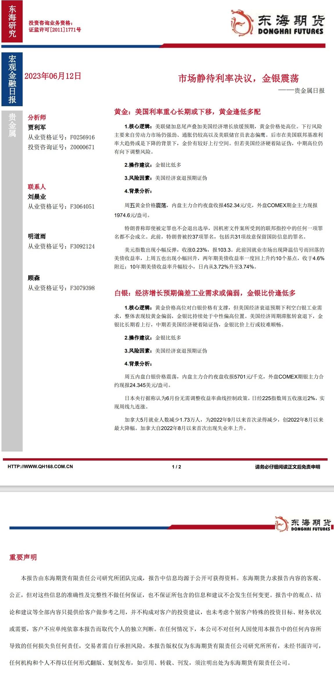 标题:【东海期货6月12日产业链日报】贵金属篇:市场静待利率决议,金银震荡