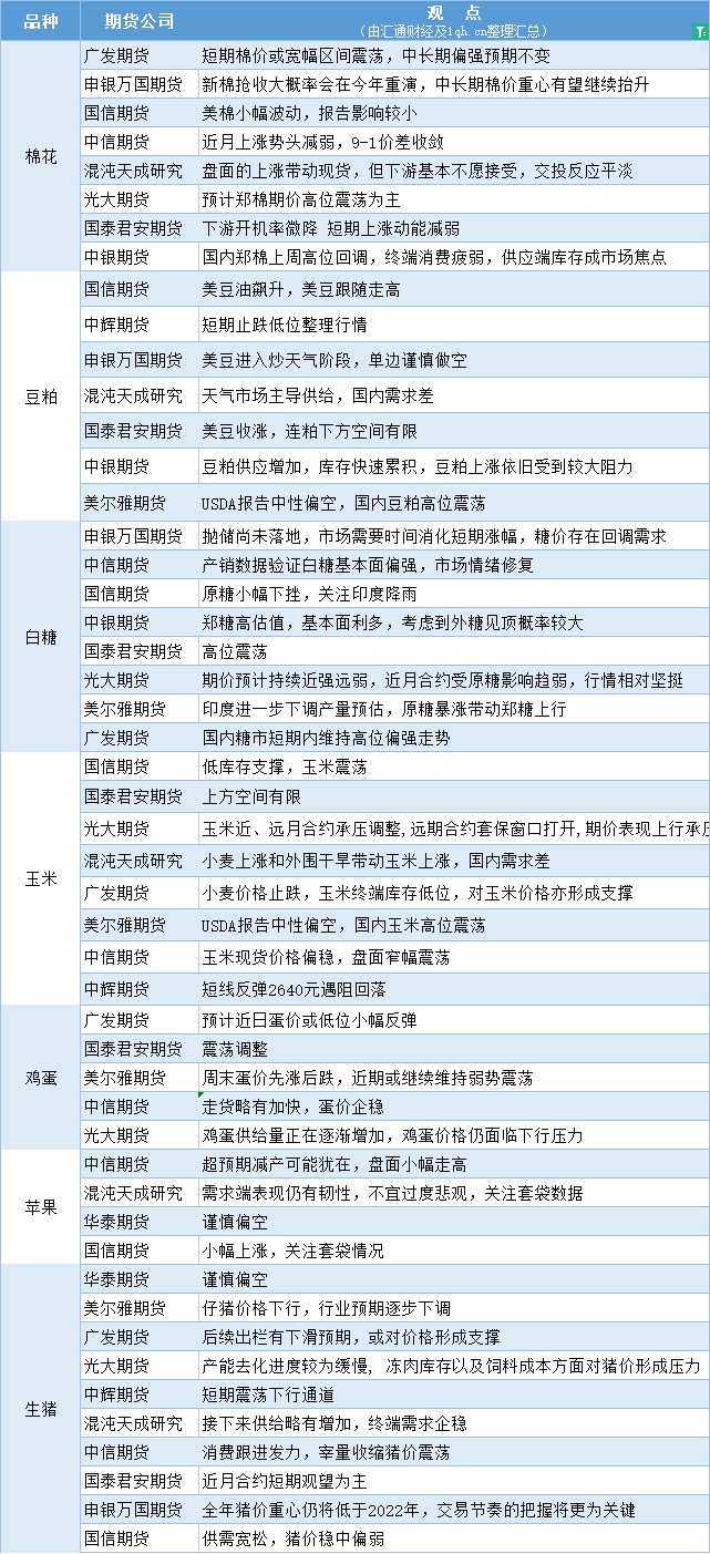 标题:期货公司观点汇总一张图:6月12日农产品(棉花、豆粕、白糖、玉米、鸡蛋、生猪等)