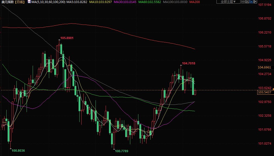美元指数上涨0.22%,至103.53。美元基本陷于区间内,投资者在等待更明确的迹象,看经济是会保持强劲且通胀保持在高位,还是会走向萎缩。