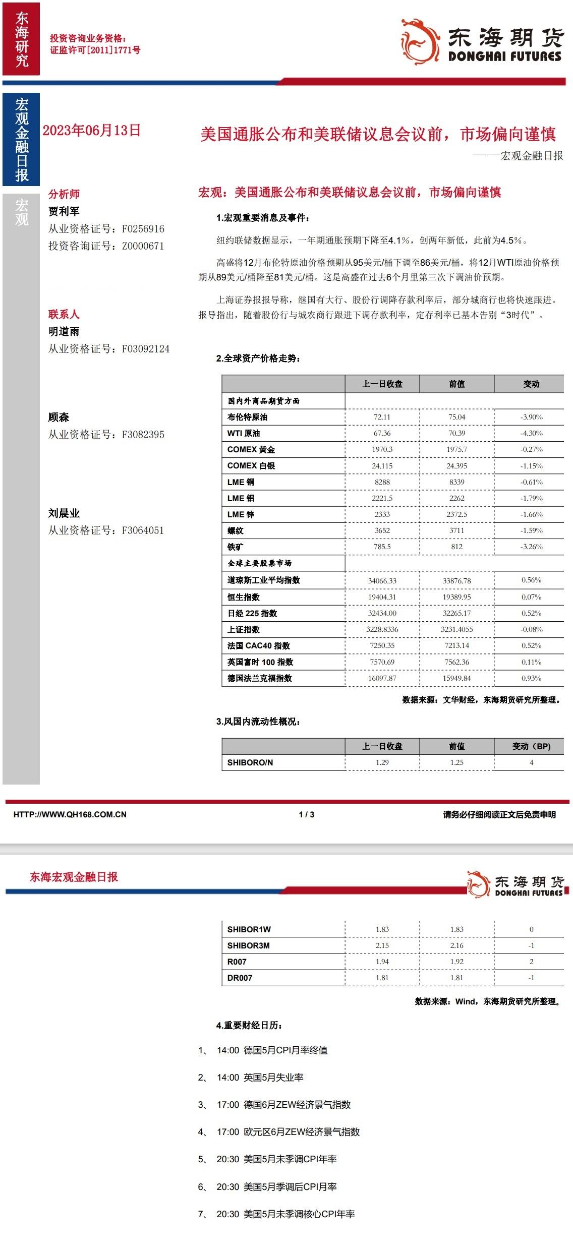 标题:【东海期货6月13日宏观金融日报】:美国通胀公布和美联储议息会议前,市场偏向谨慎