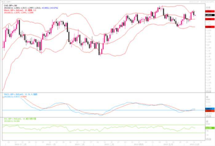 周一(6月12日)欧元兑美元持平于1.0753。投资者在本周将作出的几个关键政策决定前保持谨慎。美国5月通胀数据将在周二公布,届时美联储将开始为期两天的会议。每个人似乎都在“屏住呼吸”,等待美联储本月里的决定。根据路孚特的FedWatch工具,货币市场倾向于美联储将暂停,但大多数人预计在7月会议上将加息。相反,接受路透访查的大多数经济学家预计,通胀仍具粘性之际,欧洲央行本周将把关键利率提高25个基点,并在7月再次加息,然后在今年余下时间暂停行动。如果本周的利率会议上,美联储自2022年1月以来首次宣布保持利率不变,而欧央行则继续加息25个基点,料届时欧元或会获得机会上扬。目前日线图上,欧元兑美元略在布林带中轨线之上,MACD形成金叉,似存下回升的态势。但上方目前还是不敢尝试穿越初步的阻力1.08水平。看来一切还是要等本周四欧美央行在利率上的举动了。