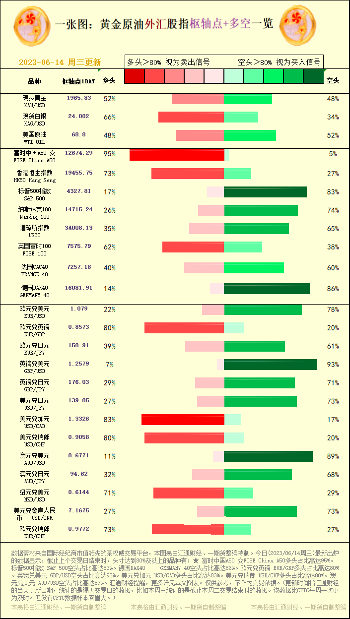 标题:一张图:2023/06/14黄金原油外汇股指"枢纽点+多空占比"一览