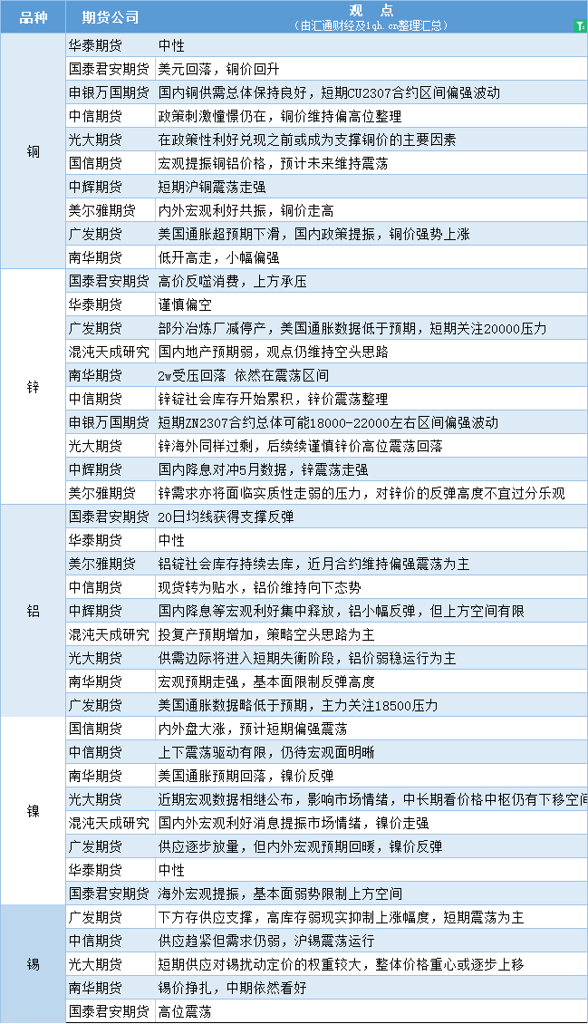 汇通财经APP讯——期货公司观点汇总一张图:6月14日有色系(铜、锌、铝、镍、锡等)