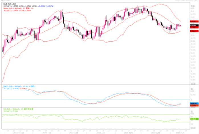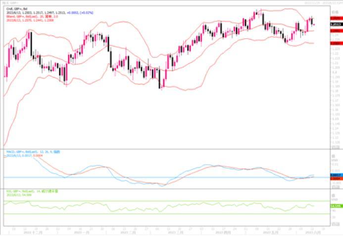 周二(6月13日)欧元兑美元上涨0.3%至1.0793美元,此前曾攀升至1.0824美元,为5月22日以来最高。周二的数据显示,美国消费者物价指数(CPI)在4月份增长0.4%后,上个月上升了0.1%。在截至5月份的12个月中,CPI攀升了4.0%,是2021年3月以来最小的同比增幅,此前4月份的增幅为4.9%。所谓的核心CPI在5月份录得了0.4%的增长,连续三个月保持相同的百分比增幅。在CPI数据公布后,巩固了美联储将在周三结束两天会议时暂停加息的预期。与美联储政策利率挂钩的期货的交易员现在预计,美联储大约有93%的机会决定放弃连续第11次加息,并在周三将指标利率保持在5.00%至5.25%。而且利率期货市场将美联储7月加息的可能性缩减至64%,低于周一晚些时候的70%以上。欧洲央行的利率决定将于周四公布,市场认为该行将加息25个基点,并在7月再加息25个基点。为此,隔夜市场上欧元的上升多少也是受到这种预期的刺激所致。对于六月份欧美央行利率的预期,暂时对欧元有利,日线图上欧元/美元继续穿越布林带中轨并向上轨靠拢,各类技术指标配合性上扬,显示出一定的欧元购置兴趣。短线上方1.0820附近构成初步阻力,须突破后,方可看到明显的上升轨迹。