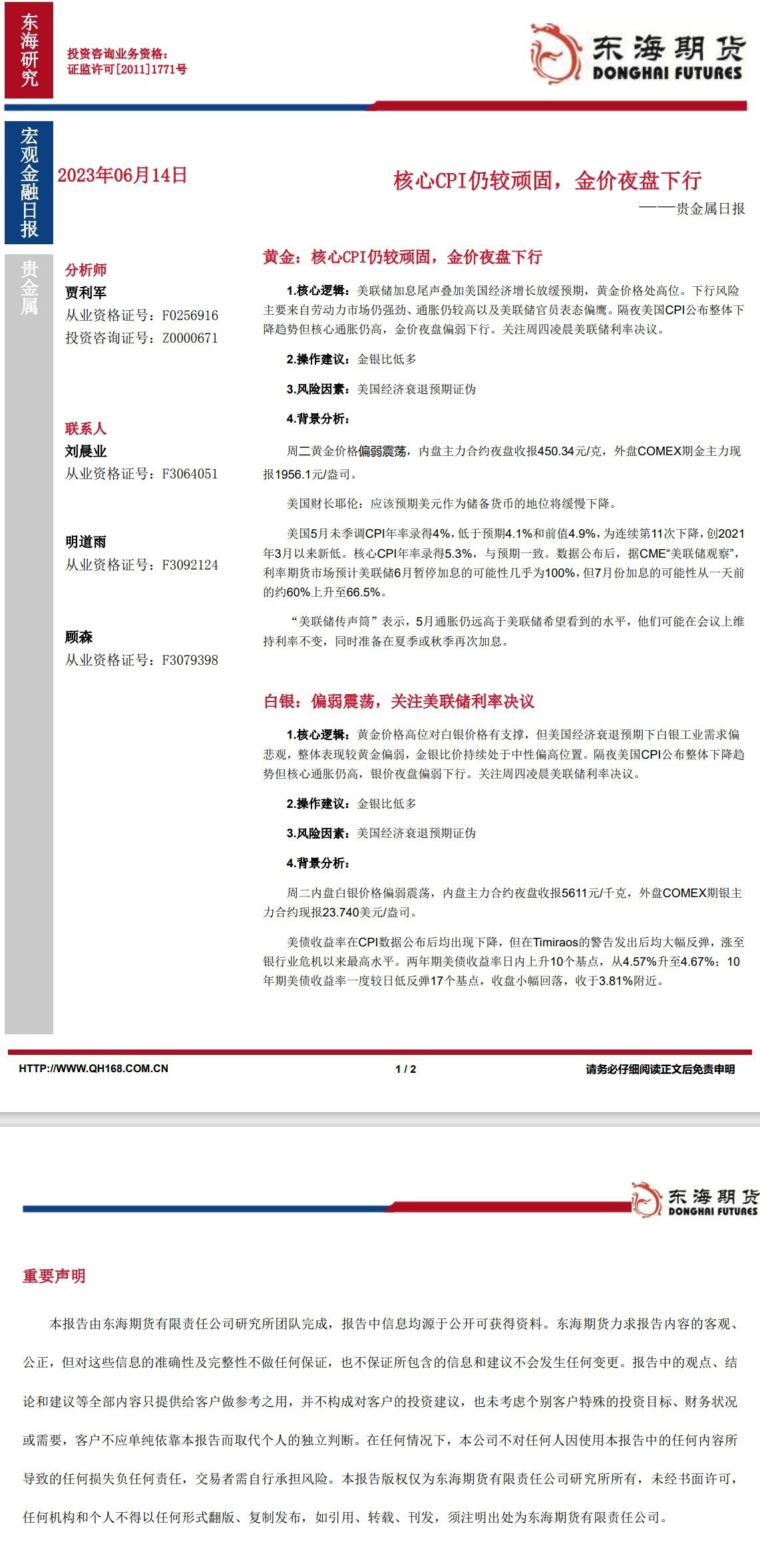 标题:【东海期货6月14日产业链日报】贵金属篇:核心CPI仍较顽固,金价夜盘下行
