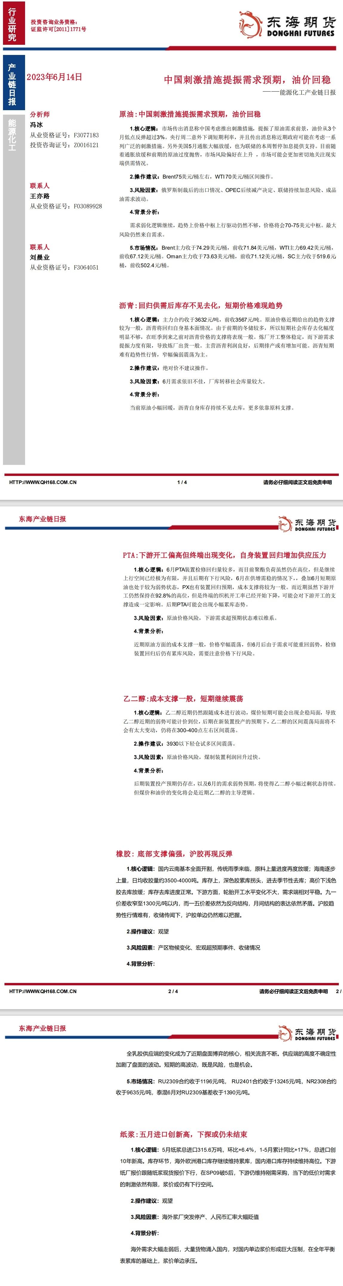 标题:【东海期货6月14日产业链日报】能化篇:中国刺激措施提振需求预期,油价回稳