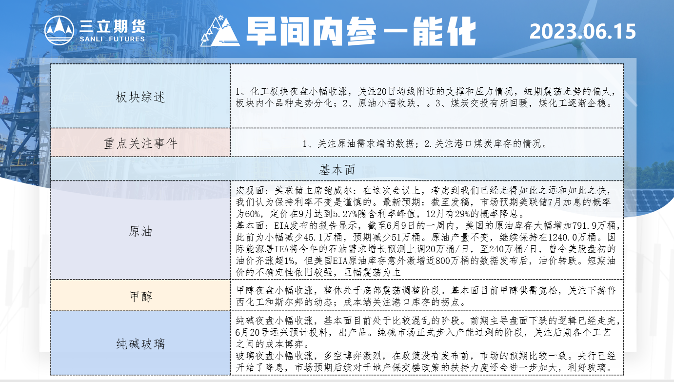 汇通财经APP讯——三立期货早间内参显示,化工板块夜盘小幅收涨,关注20日均线附近的支撑和压力情况,短期震荡走势的偏大板块内个品种走势分化。原油小幅收跌。煤炭交投有所回暖,煤化工逐渐企稳。三立期货授权文本由“专注期货开户交易及专业行情分析资讯网站”【一期货 www.1qh.cn】转发。