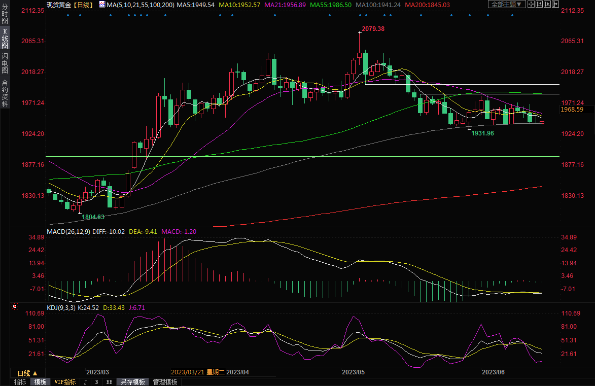 汇通财经APP讯——周四(6月15日)亚洲时段,现货黄金窄幅震荡,目前交投于1943.33美元/盎司附近,勉强守在100日均线1941.23上方。周三金价冲高回落,美国5月份PPI降幅超预期,美元指数一度跌创近四周新低至102.66,金价一度反弹至1960关口附近,但随后回吐全部涨幅,因为美联储在暂停加息的同时维持鹰派立场,并上调终端利率预期,对金价打压明显。