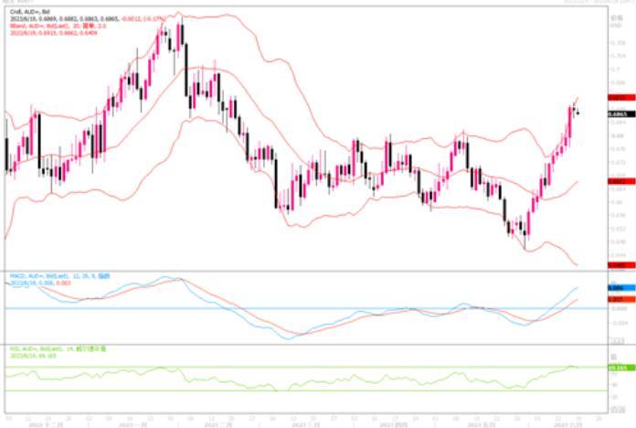 上周五(6月16日)澳元兑美元游走在0.6880美元附近,为四个月来最高水准。当前市场风险情绪大为好转,加上澳洲央行6月出乎意料地提高隔拆利率,为澳元/美元重新注入了活力。澳洲央行的鹰派态度,与美国联邦基金利率上升风险有限形成对比,刺激着澳元兑美元产生反弹性的上升。而上周五日本央行维持超低利率不变,并预测今年晚些时候通胀将放缓,重申其鸽派立场,日元在与所有的货币对交易中都应声走低,也是间接刺激澳元维持住强势。日线图上,澳元/美元在0.6900整数关口前遇到初步的阻力,恐存在一定的获利回吐调整的风险。经调整后,若能企稳0.6800之上,则后市继续攀高仍可期待。