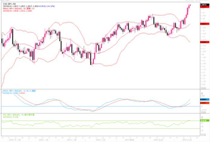 上周五(6月16日)英镑兑美元继续上挺0.31%,收盘在1.2825,盘中最高触碰1.2853,创下六个月来的最大周线涨幅。上周一系列因素提振了英镑兑美元,包括数据显示英国工资上涨速度远超预期,提高了投资者对英国央行将不得不进一步加息的预期。英国央行主要利率目前为4.5%,根据衍生品市场走势,周五交易员预计到明年年初将升至5.75%左右。在英镑利率预期继续走高的加持下,英镑/美元近期的升势较为凌厉。短线须防范一定获利回吐调整,下方留意1.2760、1.2700这些点位的支撑,若回调后稳稳企立上述支撑水平之上,英镑/美元仍可冀望继续向高点攀升。