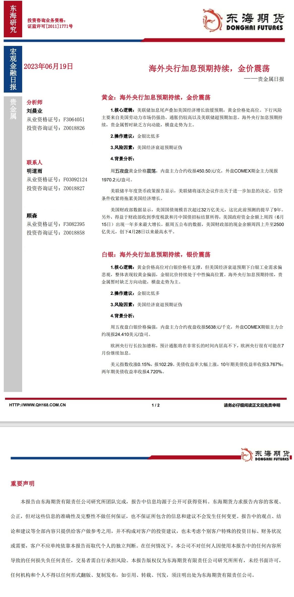 标题:【东海期货6月19日产业链日报】贵金属篇:海外央行加息预期持续,金价震荡