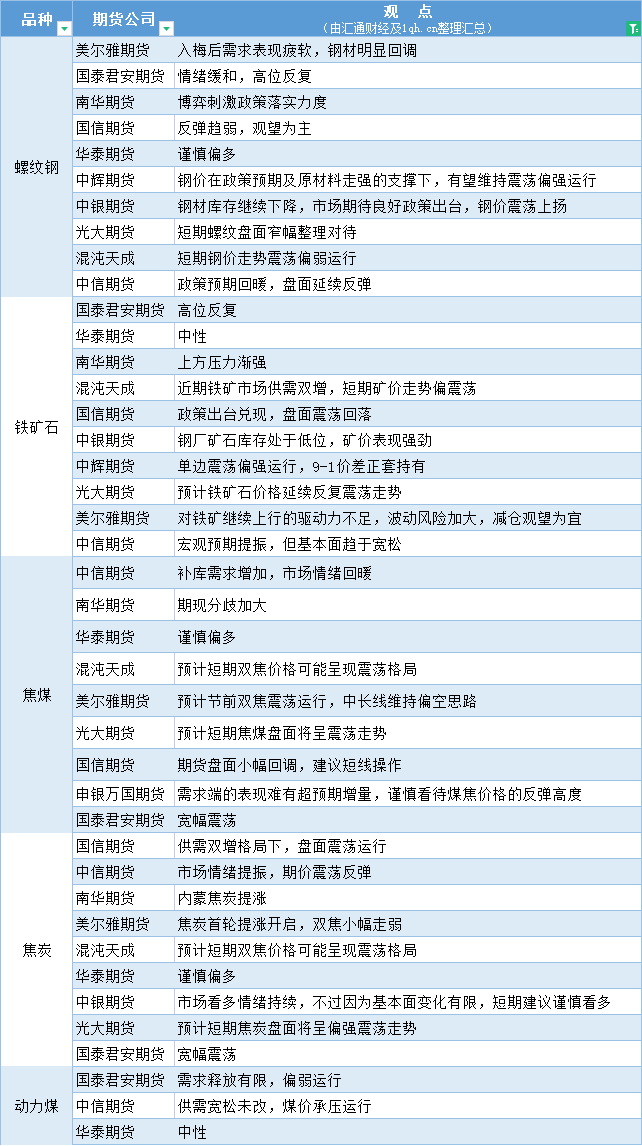 汇通财经APP讯——期货公司观点汇总一张图:6月20日黑色系(螺纹钢、焦煤、焦炭、铁矿石、动力煤等)