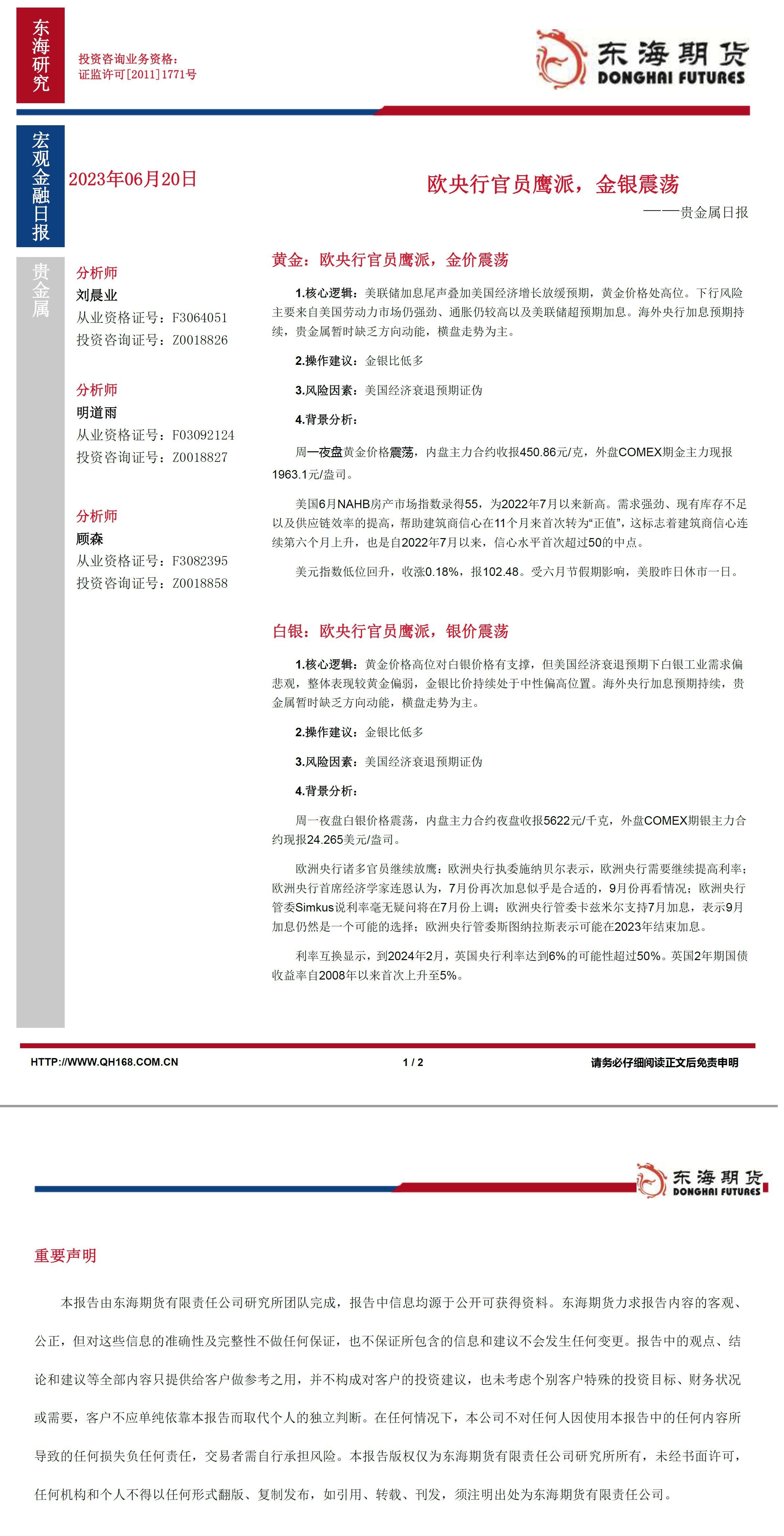 标题:【东海期货6月20日产业链日报】贵金属篇:欧央行官员鹰派,金银震荡