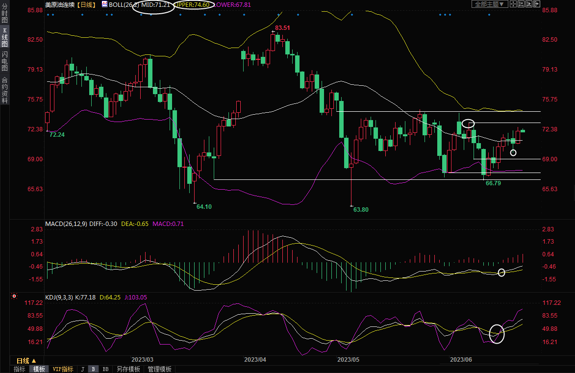 日线级别:震荡;MACD金叉,KDJ金叉,5日均线连续上穿10日均线和21日均线,油价初步顶破布林线中轨,短线偏向多头,后市有望进一步上探布林线上轨74.60附近阻力,100日均线和近期震荡区间上沿阻力都在该位置附近,如果进一步上破,则增加中线看涨信号,进一步较强的阻力参考4月28日高点76.91和200日均线78.02附近。