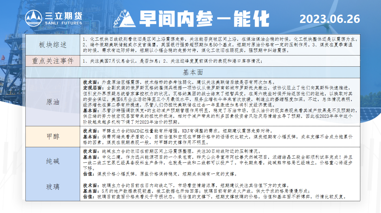 汇通财经APP讯——三立期货早间内参显示,化工板块日线级别看依旧是区间上沿震荡走势,关注能否突破区间上沿,在煤油企稳的时候,化工板冲整体还是以震荡为主。端午假期美联储鲍威尔发言偏鹰,英国银行强势超预期加息50个基点,短期对原油价格有一定的压制作用。