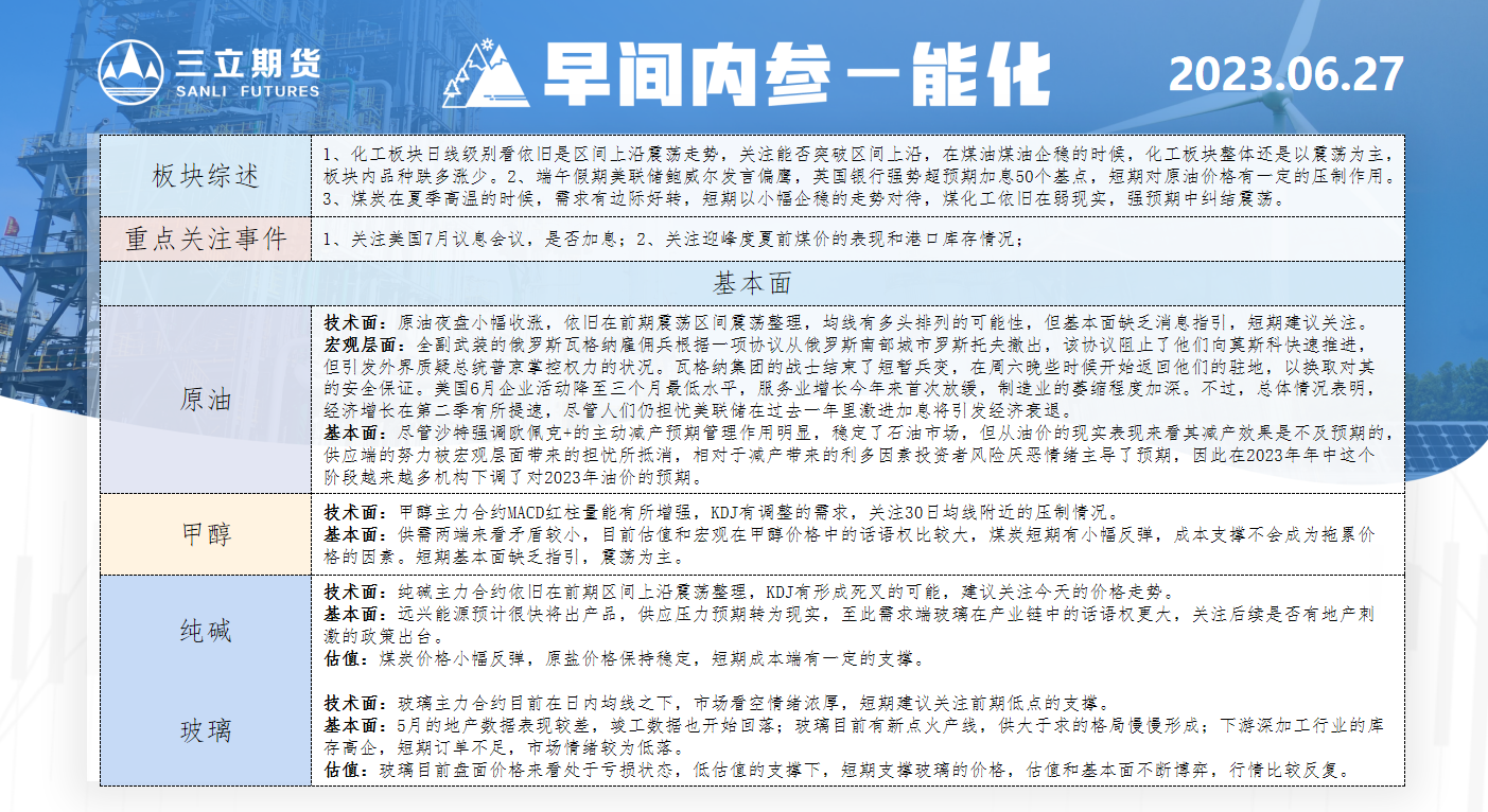 汇通财经APP讯——三立期货早间内参显示,化工板块日线级别看依旧是区间上沿震荡走势,关注能否突破区间上沿,在煤油企稳的时候,化工板块整体还是以震荡为主,板块内品种跌多涨少。三立期货授权文本由“专注期货开户交易及专业行情分析资讯网站”【一期货 www.1qh.cn】转发。