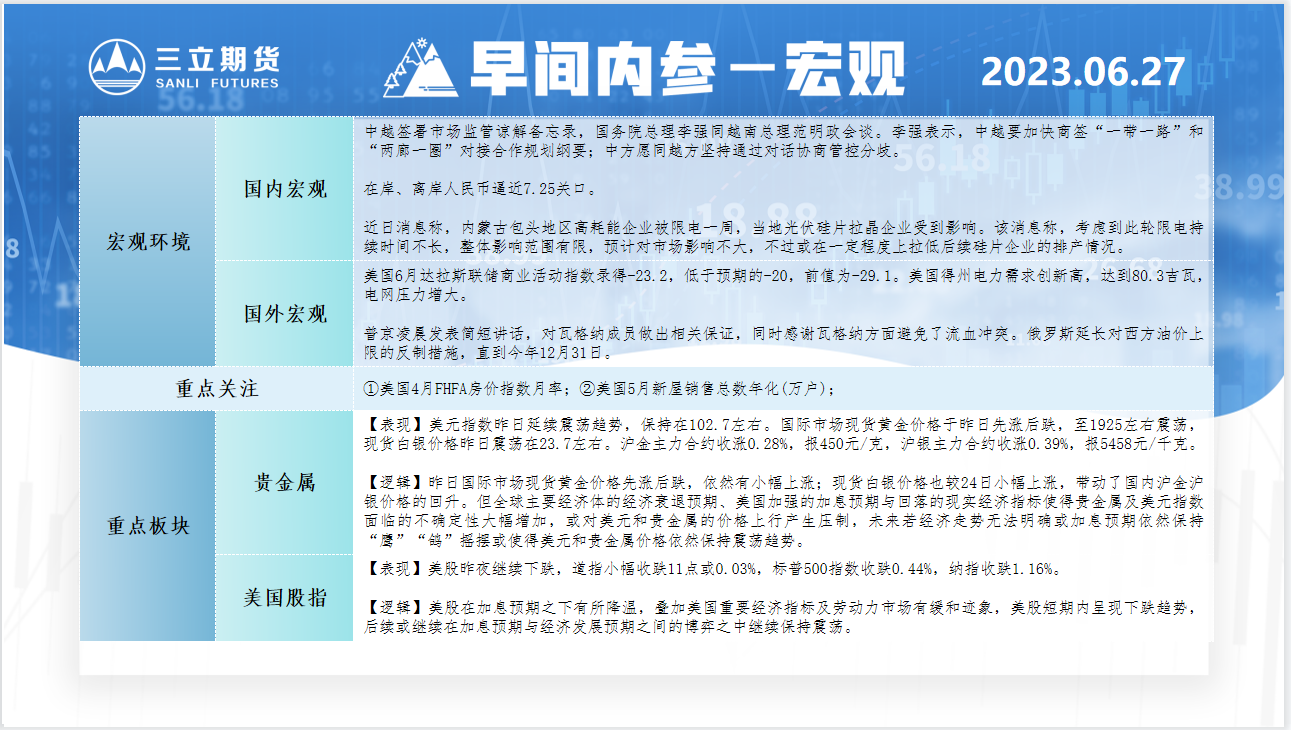 汇通财经APP讯——三立期货早间内参显示,美元指数昨日延续震荡趋势,保持在102.7左右。国际市场现货黄金价格于昨日先涨后跌,至1925左右震荡。现货白银价格昨日震荡在23.7左右。沪金主力合约收涨0.28%,报450元/克,沪银主力合约收涨0.39%,报5458元/千克。