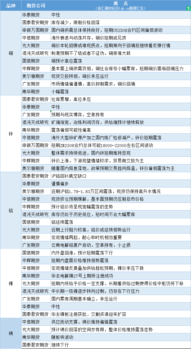 汇通财经APP讯——期货公司观点汇总一张图:6月28日有色系(铜、锌、铝、镍、锡等)