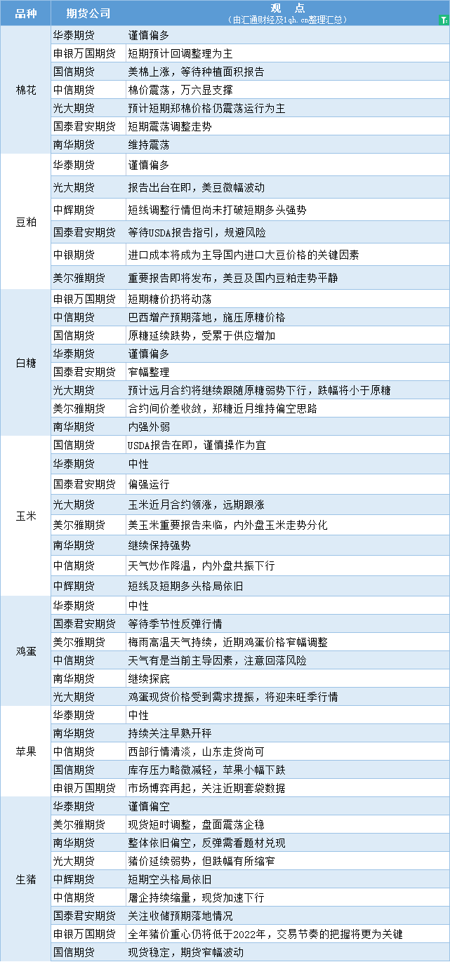 汇通财经APP讯——期货公司观点汇总一张图:6月30日农产品(棉花、豆粕、白糖、玉米、鸡蛋、生猪等)