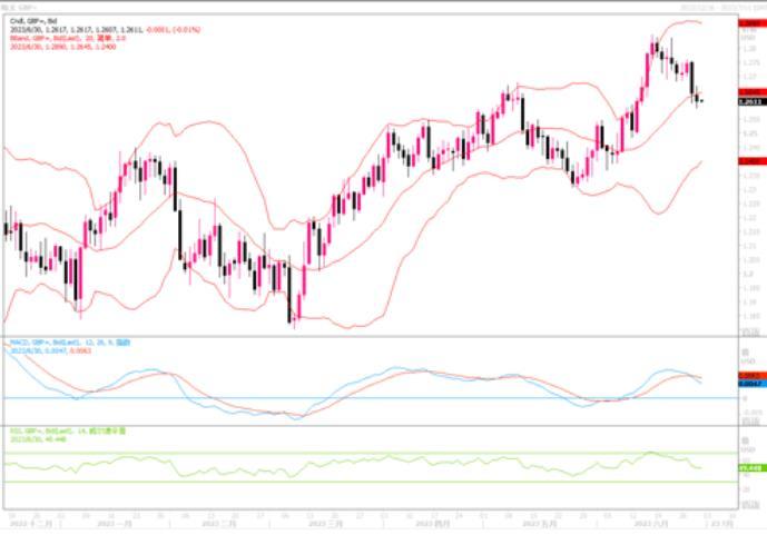 周四(6月29日)英镑兑美元继续下跌0.17%,收盘于1.2614。由于英国央行总裁贝利表示利率可能继续上升,引发对企业部门面临更广泛困难的担忧,因为企业正在努力应对借款成本的快速上升。为此,投资者现在开始担心,英国为遏制根深蒂固的通胀而进一步加息,带之而来的将会越来越制约着经济的发展,这对英国经济和英镑来说都是坏消息。日线图上,英镑/美元回落至20日均线下方,技术指标MACD形成死叉,显示回落风险加重。若1.2600失守,下行空间将会进一步拓深。