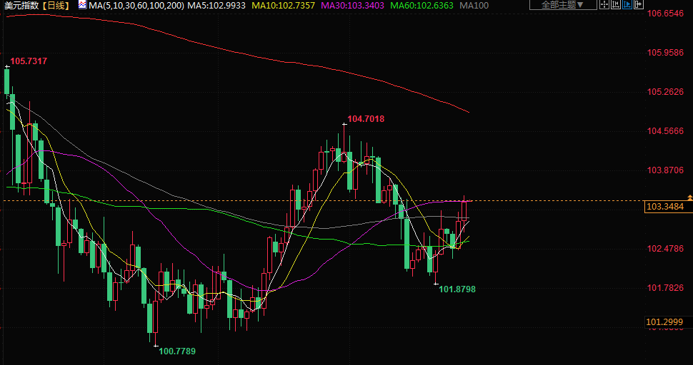 美元指数上涨0.35%,报103.310,稍早一度触及103.44的6月13日以来最高水平。