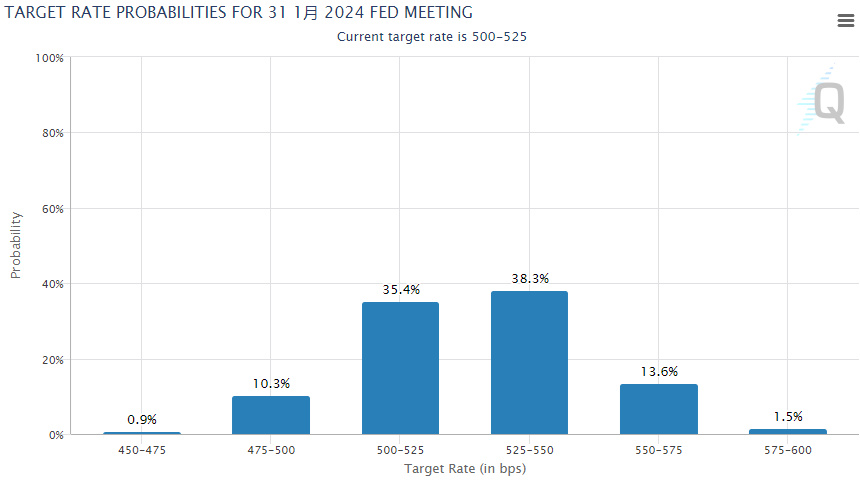 但根据CME的“联储观察”工具最新数据,美联储下半年只会再加息一次——7月份25个基点。此后直到2024年1月,利率将一直保持在5.25%-5.50%区间。2024年3月启动降息。