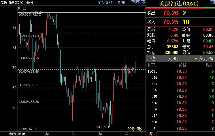 北京时间16:34,NYMEX原油期货上涨0.74%至70.38美元/桶;ICE布伦特原油期货上涨0.81%至75.11美元/桶。