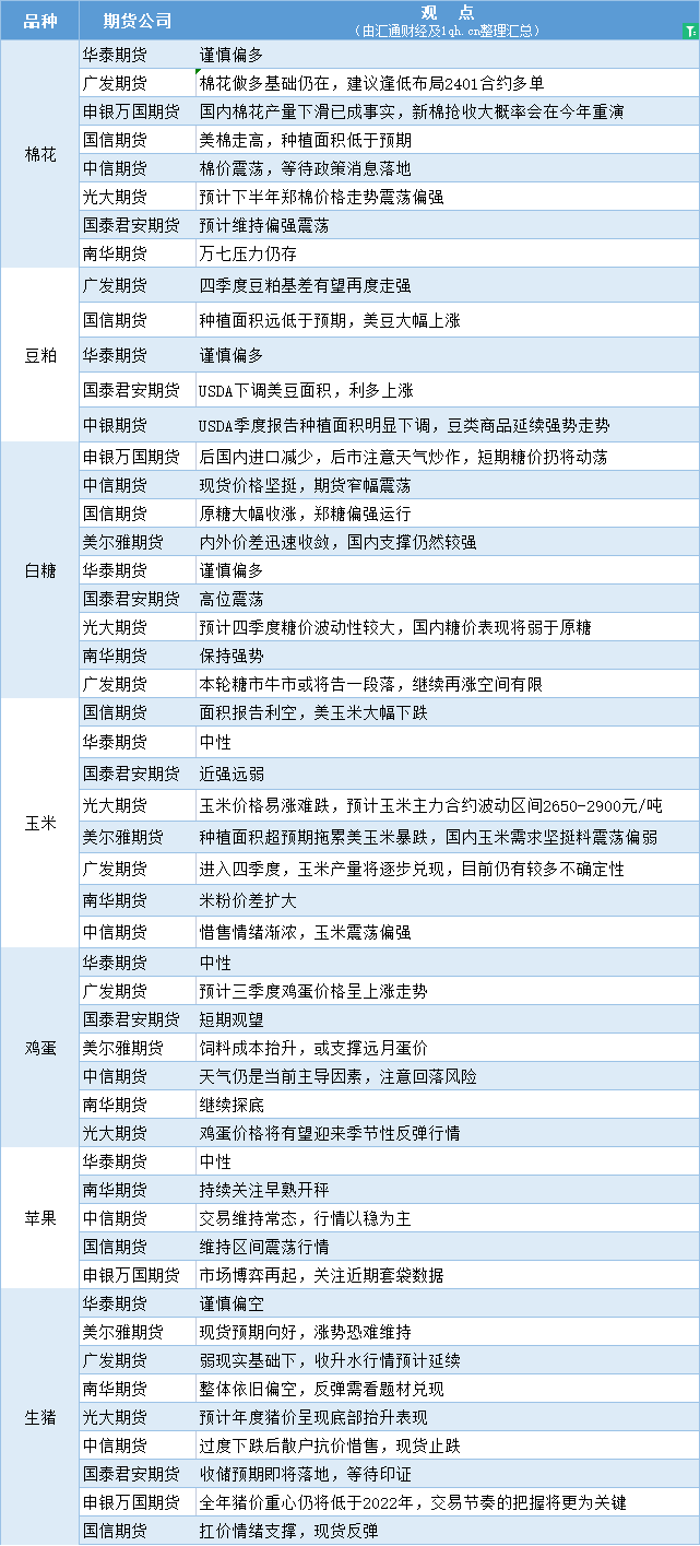 汇通财经APP讯——期货公司观点汇总一张图:7月3日农产品(棉花、豆粕、白糖、玉米、鸡蛋、生猪等)