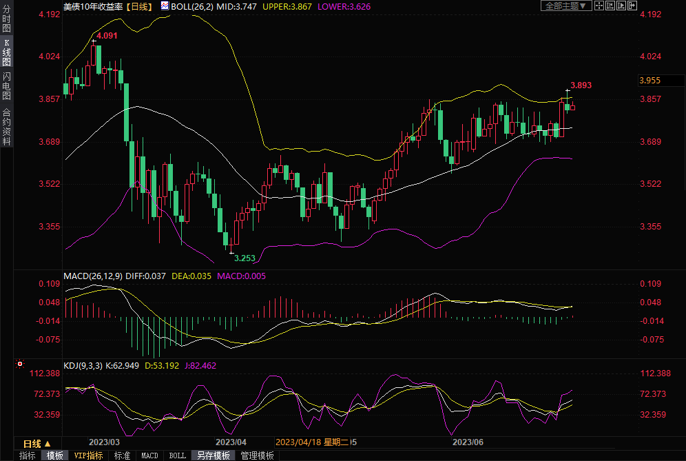 美国10年期国债收益率目前交投于3.838%附近,涨幅约0.5%,上周五该收益率下跌0.83%,收报0.819%,盘中一度创三个半月新高至3.893%。