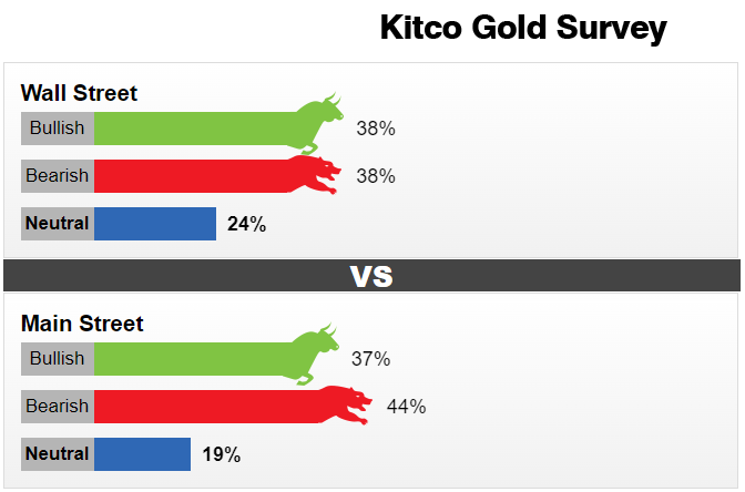上周,21位华尔街分析师参加了KITCO调查。看空后市和看涨后市的分析师均有八名(38%),另外5名分析师(24%)认为,未来一周金价将横盘整理,偏向中性。
